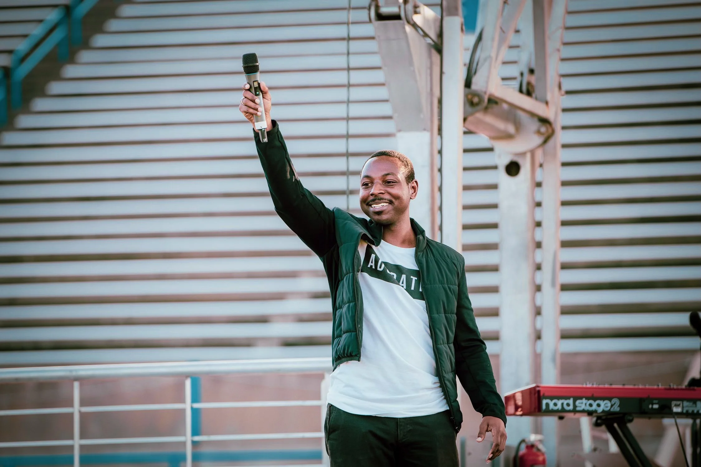 Man in black jacket holding a microphone with raised arm, standing on stage in front of bleachers, smiling.